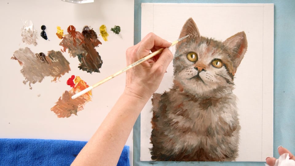 נמשיך בצביעה של שכבות נוספות של הראש ובנוסף נצבע את גוף החתול תוך הקפדה על כיון הפרווה והגוונים השונים.