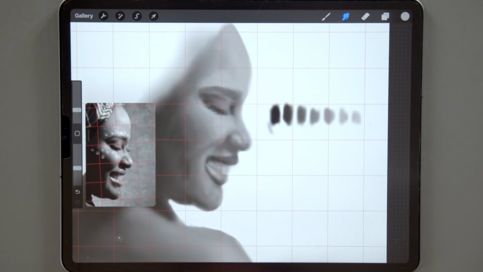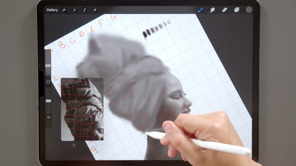 ציור פורטרט בגווני שחור-לבן, תוך שימוש בטכניקת הגריד.