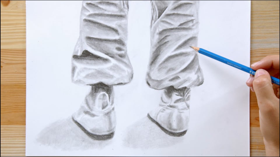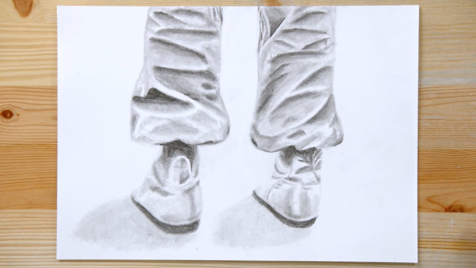 בשיעור זה נצייר את הפרוייקט המסכם: ציור של רגלי חייל. הציור משלב את קפלי הבד של המכנסיים ושל נעליי העור.