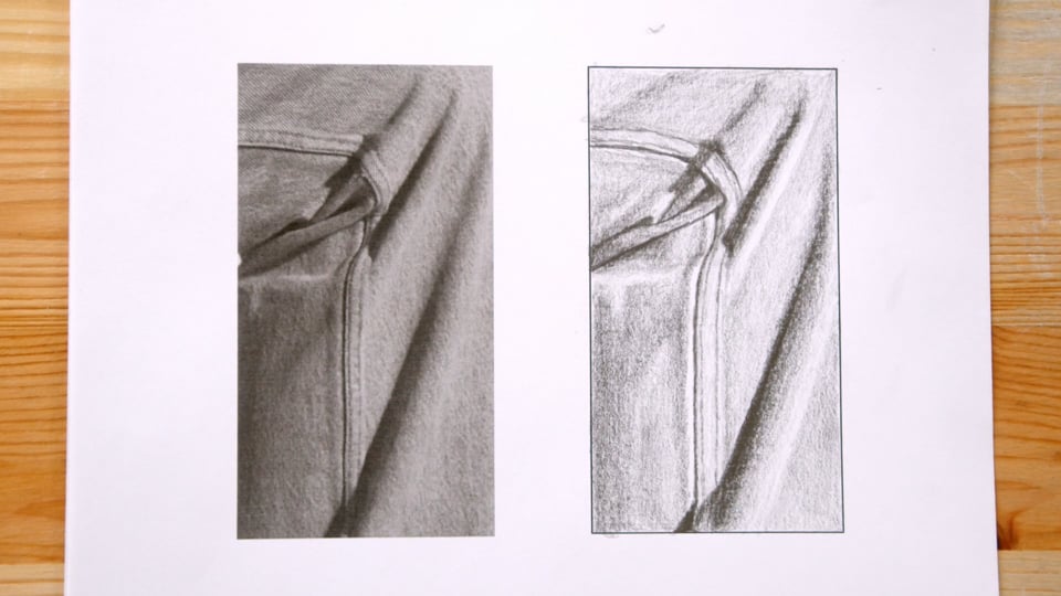 בתרגול השני נצייר חלק מתצלום של מכנס ג'ינס. בציור זה ניתן דגש גם לטקסטורה המחוספסת של הג'ינס.
